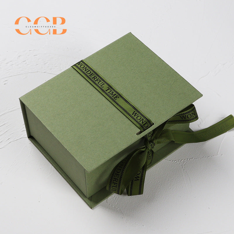 olive green gift box, ribbon closure packaging, wholesale jewelry box, custom logo retail box, flip lid keepsake box, bridesmaid proposal gift, sage green wedding box, small business supplies, luxury satin ribbon box, personalized green box, rigid cardboard box, necklace earring packaging, bulk set